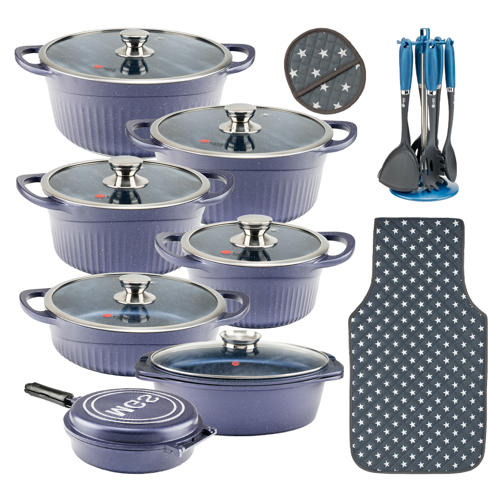 سرویس قابلمه 25 پارچه گرانیت طرح جرمنی D یک سرویس ظروف پخت و پز عالی برای هر سلیقهای است. این ست شامل چهار قابلمه در سایزهای 20/24/28/32 و تابه دو دسته سایز 28 بعلاوه یک تابه دو طرفه گرد، یک تابه مرغ پز سه تکه، ست کفگیر و ملاقه 7 عددی، دو عدد دستگیره و یک عدد پیشبند میباشد.