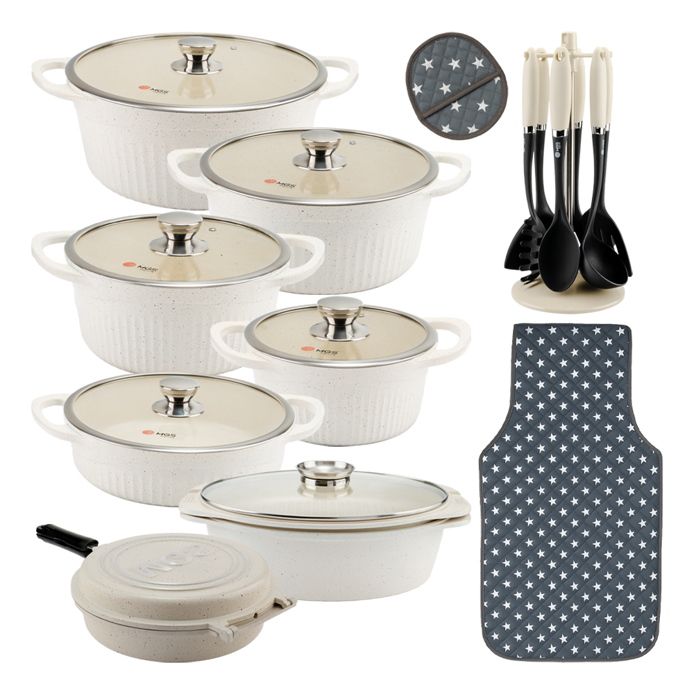 این سرویس قابلمه 25 پارچه جرمنی شامل 4 قابلمه و 4 درب پیرکس بعلاوه یک تابه تک دسته، تابه دو دسته سایز 28 بعلاوه یک تابه دو طرفه گرد، یک تابه مرغ پز سه تکه، یک عدد پیشبند و دو عدد دستگیره است. جنس روکش این ست، گرانیت نچسب است. نحوه ساخت این سرویس قابلمه 25 پارچه دایکست و دستههای آن به بدنه متصل است.