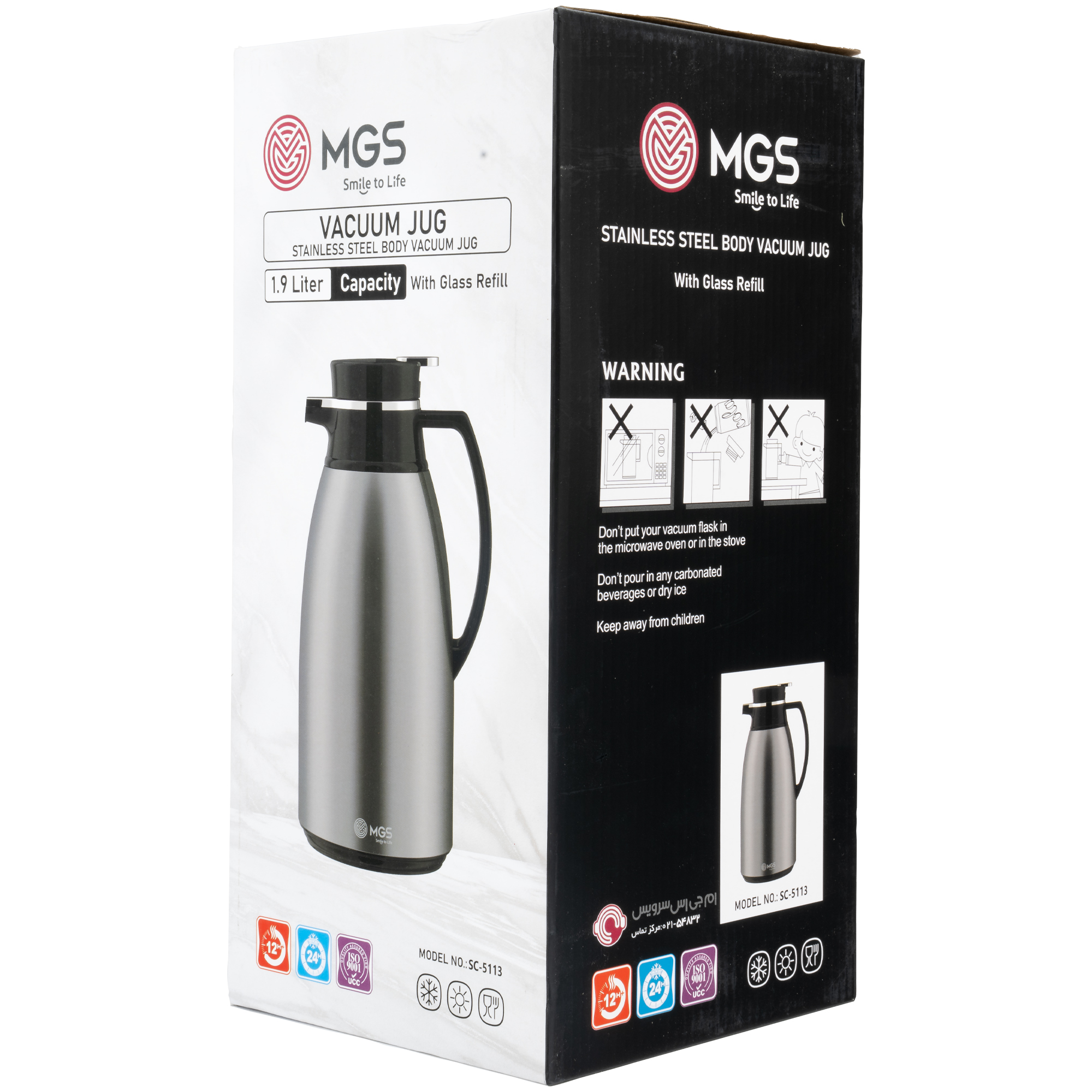 فلاسک 1.9 لیتر استیل قلمی MGS کد SC-5113 یک فلاسک دسته دار با بدنه استیل است. این ابزار کاربردی یک لیتر گنجایش دارد و به مدت 24 ساعت مایعات را در دمای ثابت نگه‌می‌دارد. شما می‌توانید بدون نگرانی از نشتی از این فلاسک در سفر یا پیک نیک استفاده کنید.