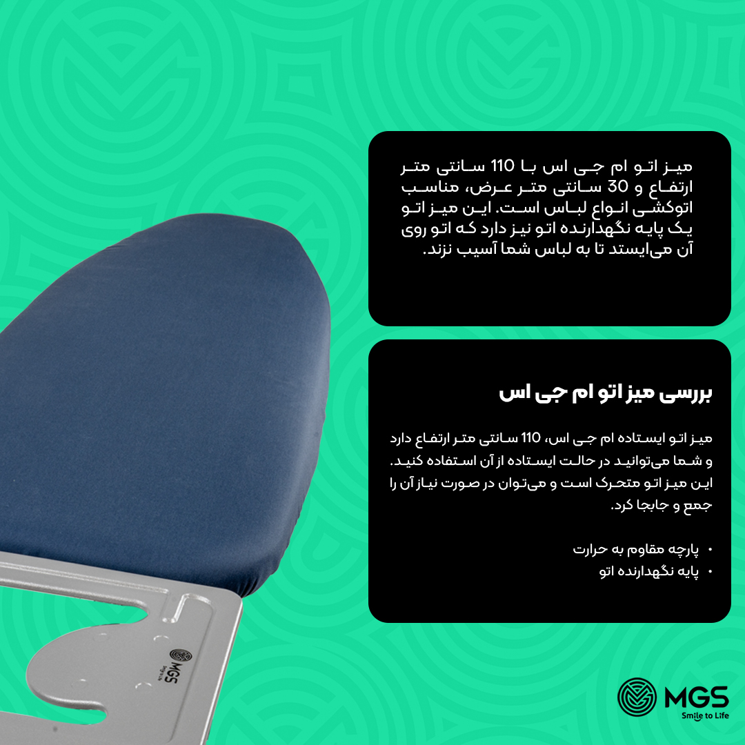 میز اتو ام جی اس با 110 سانتی متر ارتفاع و 30 سانتی متر عرض، مناسب اتوکشی انواع لباس است. این میز اتو یک پایه نگهدارنده اتو نیز دارد که اتو روی آن می‌ایستد تا به لباس شما آسیب نزند.