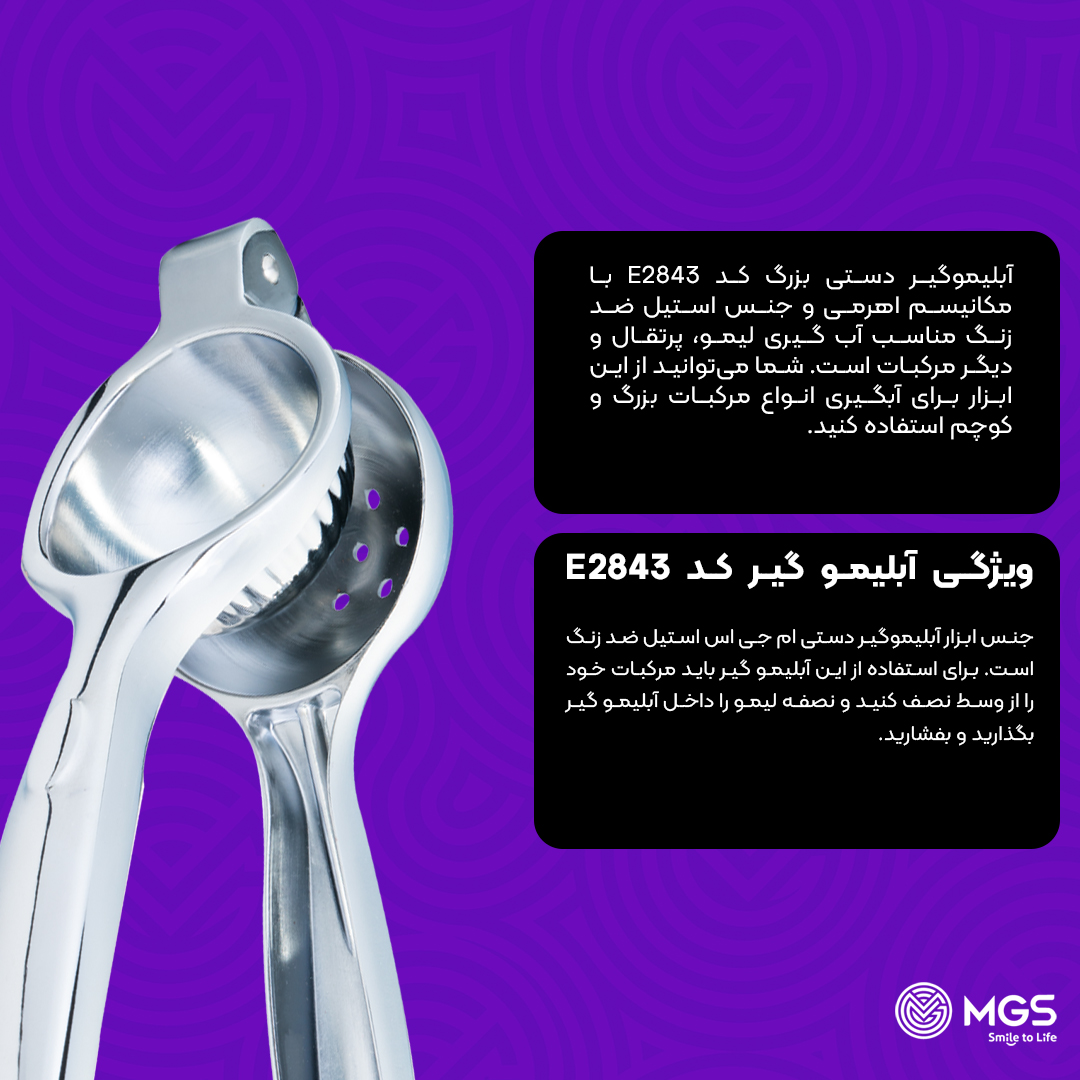 آبلیموگیر دستی کوچک کد E2843 با مکانیسم اهرمی و جنس استیل ضد زنگ مناسب آب گیری لیمو، پرتقال و دیگر مرکبات است. شما می‌توانید از این ابزار برای آبگیری انواع مرکبات بزرگ و کوچم استفاده کنید.