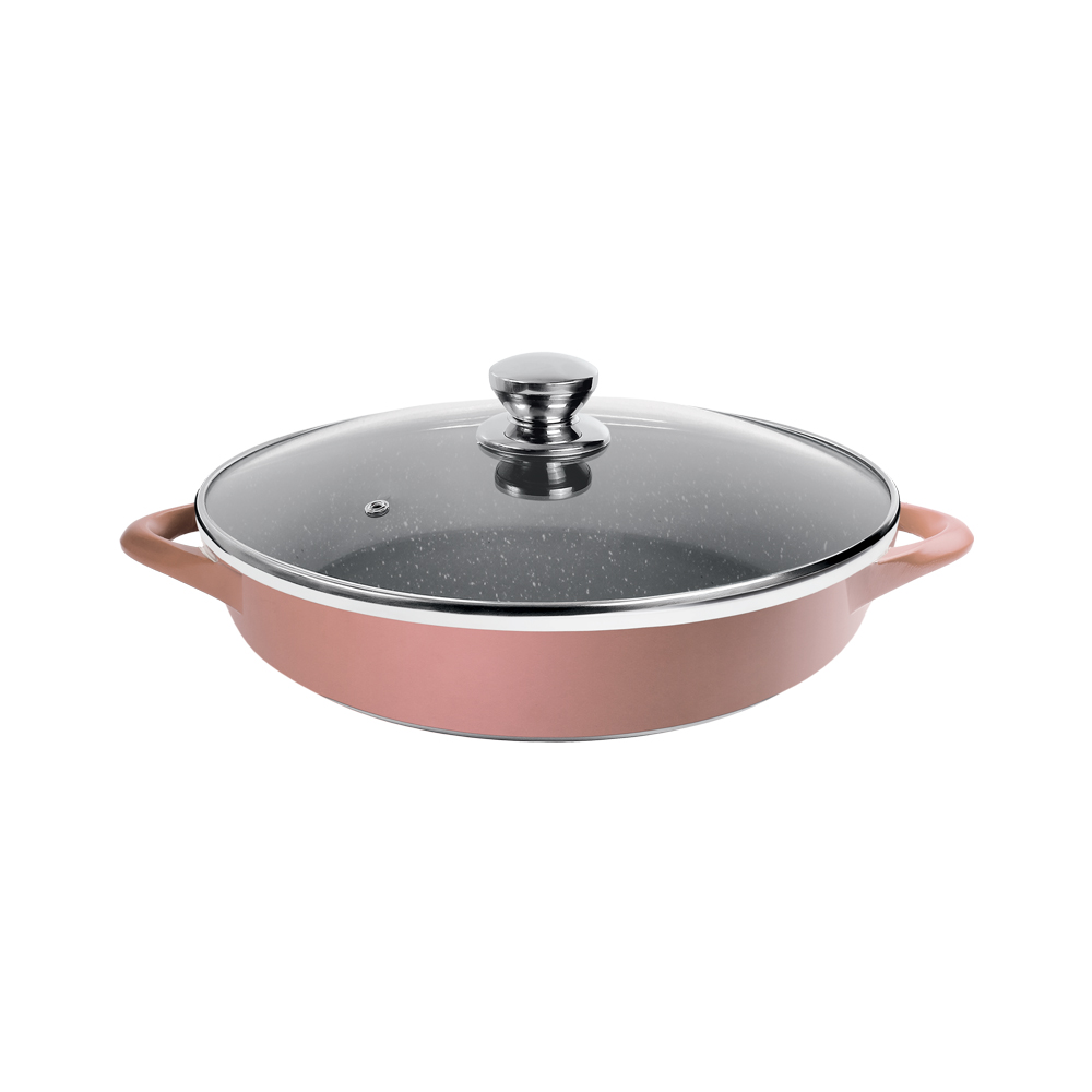 تابه تک طرح دایکست سایز 28 روکشی از جنس گرانیت نچسب دارد که به آشپزی آسان و بیدردسر کمک میکند. درب این محصول از جنس پیرکس است.