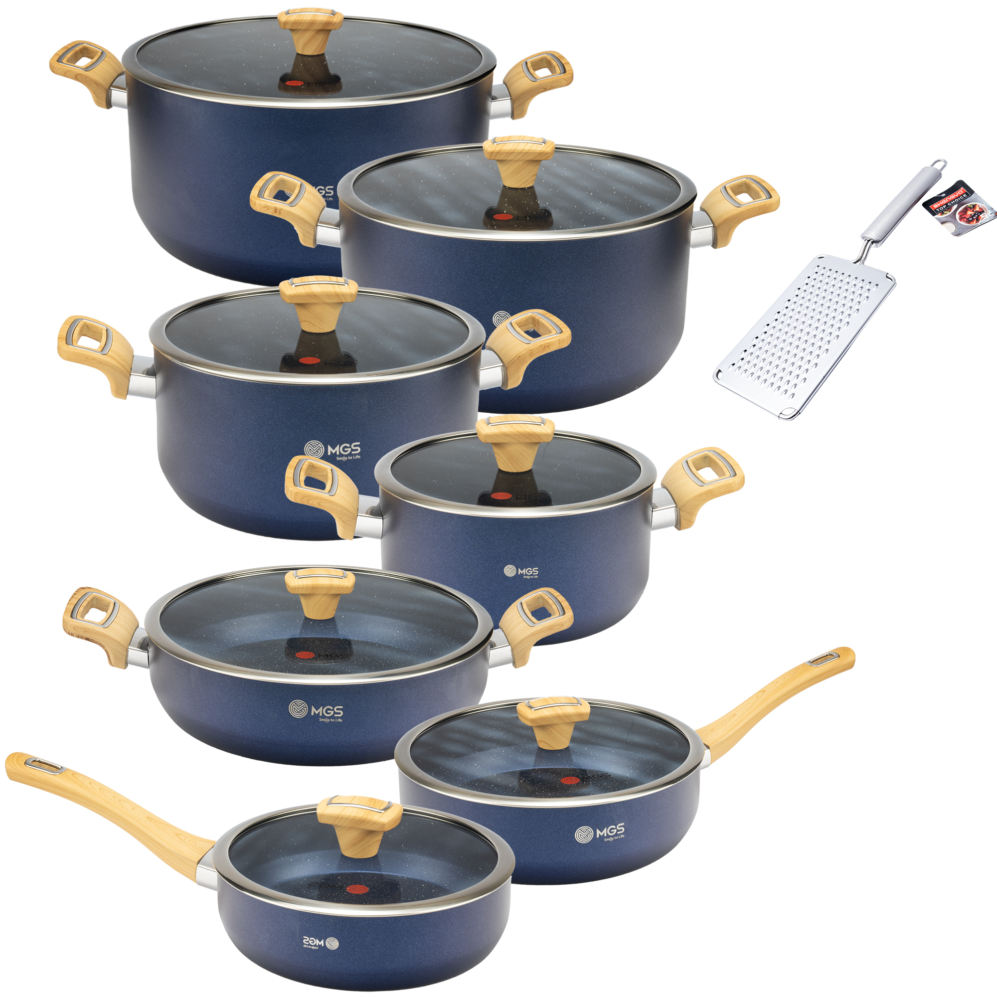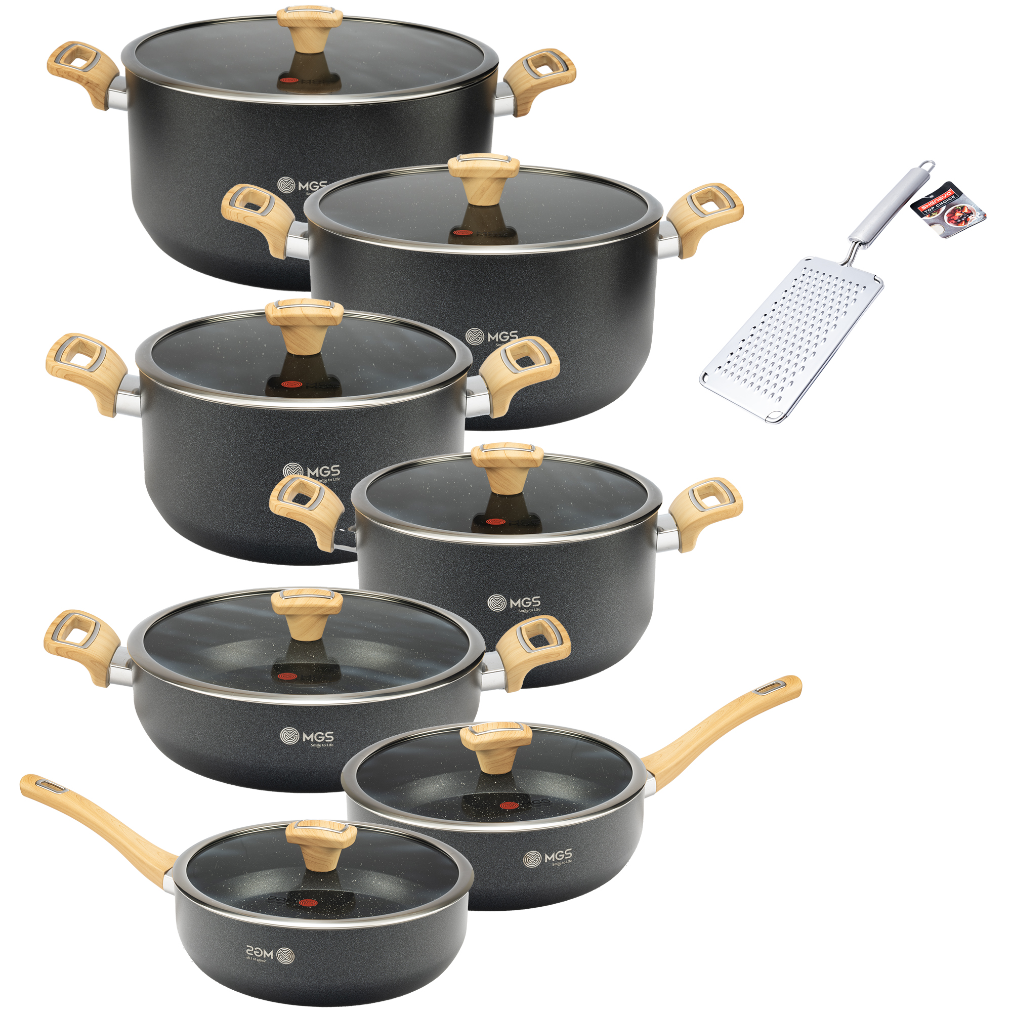سرویس قابلمه 15 پارچه MGS مدل گارنت یک سرویس ظروف پخت و پز عالی برای هر سلیقهای، از جنس گرانیت و مدل کششی است است. این ست شامل سه قابلمه در سایزهای 20/24/28/32 و یک تابه دو دسته سایز 28 بعلاوه دو تابه تک دسته 24 و 20 و یک رنده استیل میباشد.