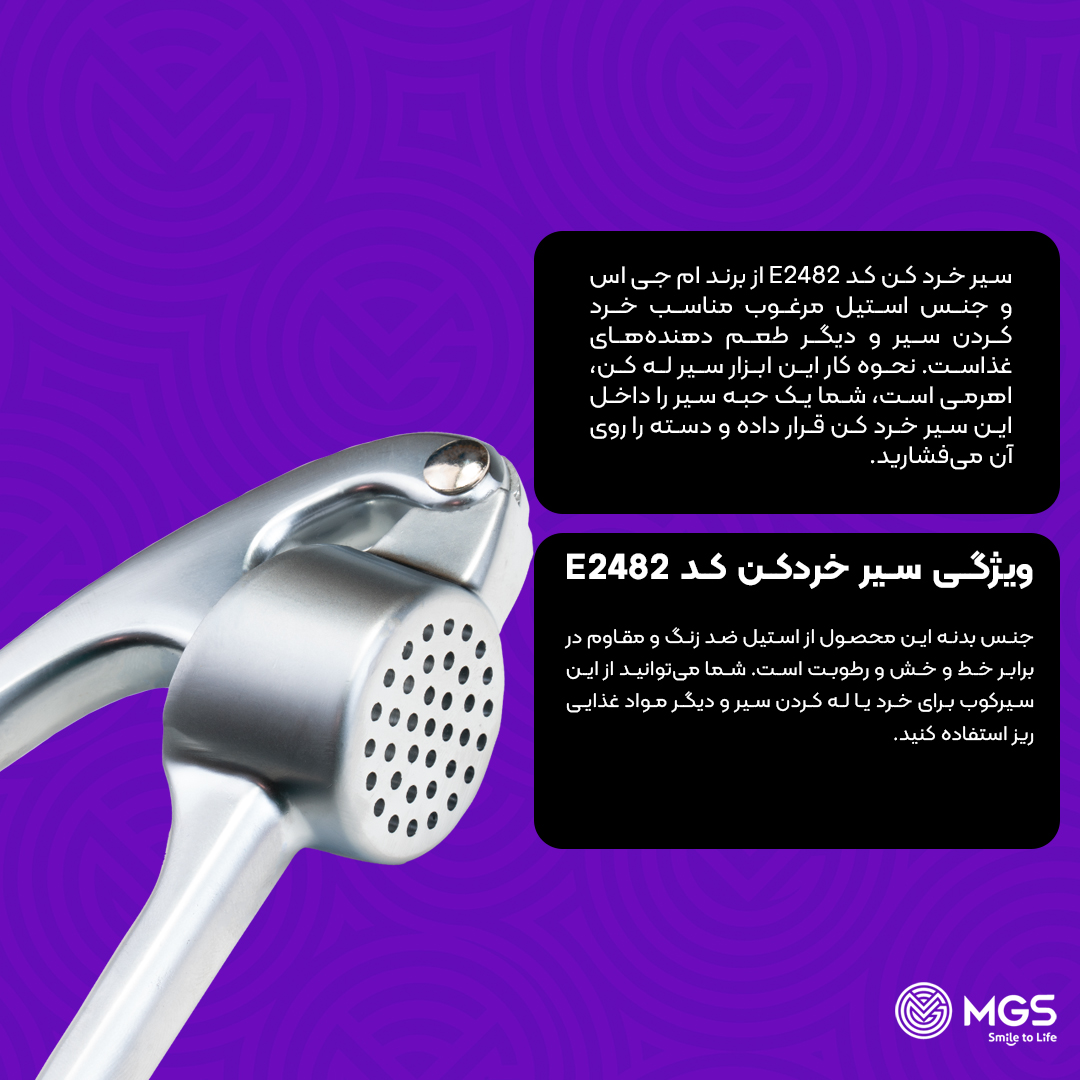 سیر خرد کن کد E2482 از برند ام جی اس و جنس استیل مرغوب مناسب خرد کردن سیر و دیگر طعم دهنده‌های غذاست. نحوه کار این ابزار سیر له کن، اهرمی است، شما یک حبه سیر را داخل این سیر خرد کن قرار داده و دسته را روی آن می‌فشارید.