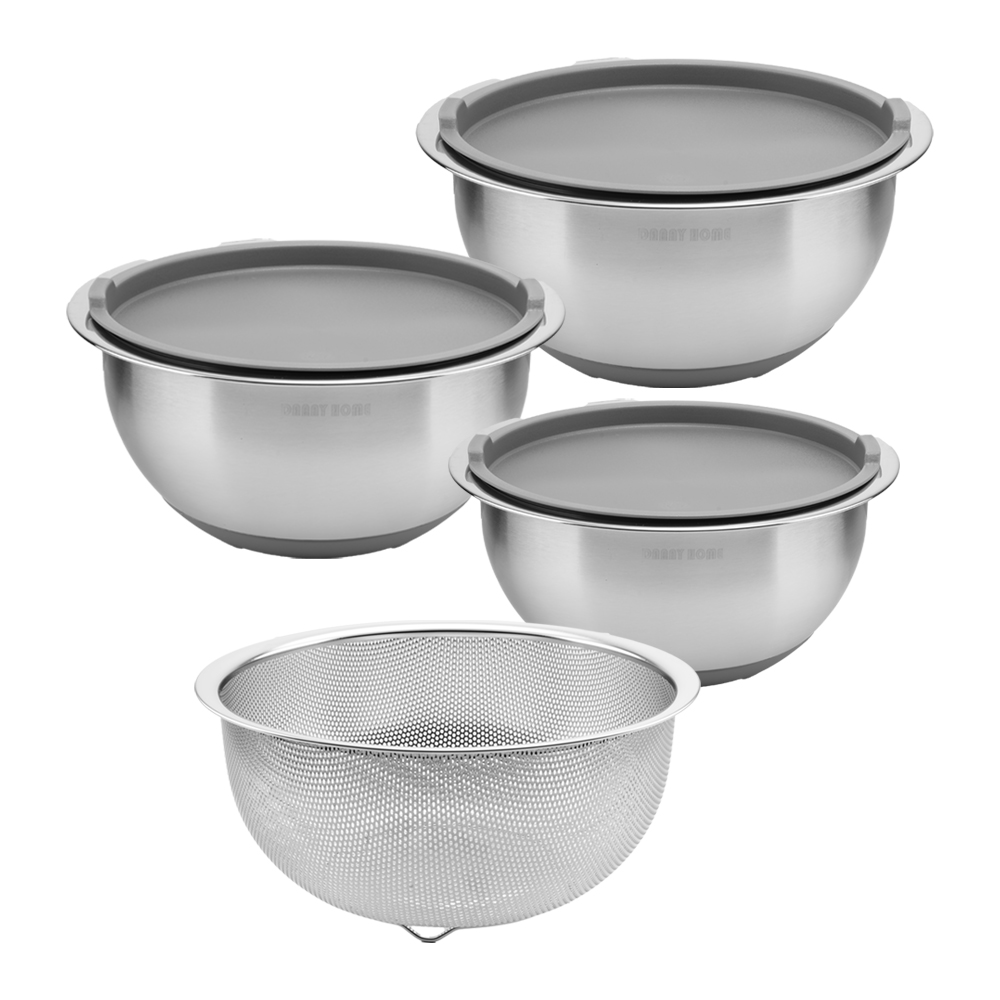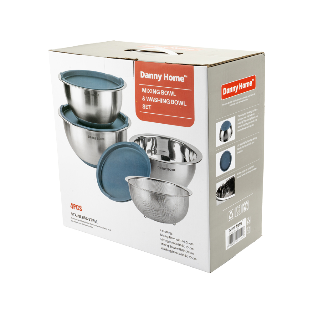ست آبکش و لگن 7 پارچه دنی هوم شامل سه کاسه همراه درب و یک آبکش از جنس استیل ضد زنگ است.