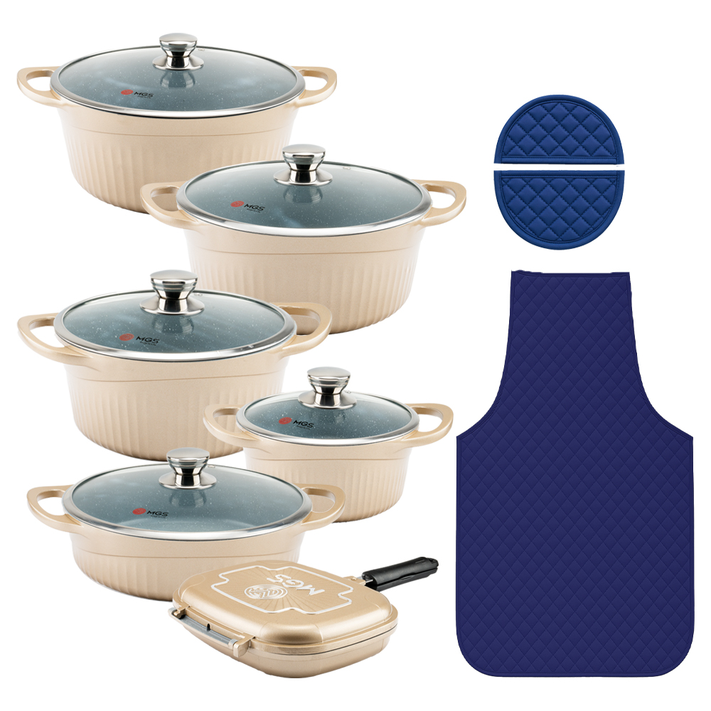 سرویس قابلمه 15 پارچه گرانیت طرح جرمنی D یک سرویس ظروف پخت و پز عالی برای هر سلیقهای است. این ست شامل چهار قابلمه در سایزهای 20/24/28/32 و تابه دو دسته سایز 28 بعلاوه یک تابه دوطرفه، دو عدد دستگیره و یک عدد پیشبند میباشد.