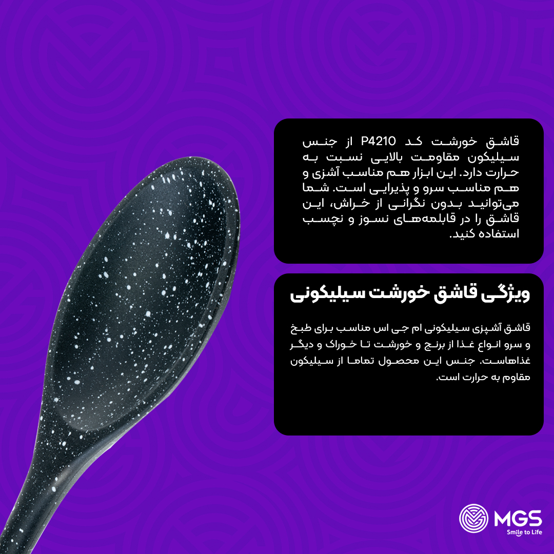 قاشق سیلیکونی ام جی اس مناسب آشپزی و سرو غذا است. این قاشق آشپزی تماما از سیلیکون مقاوم به حرارت ساخته شده‌است.