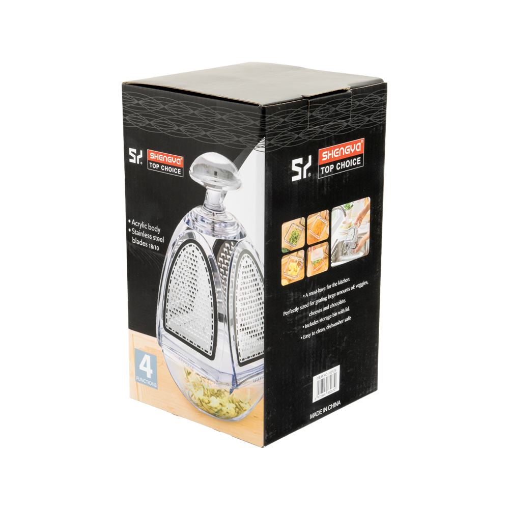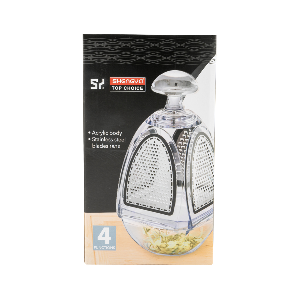 رنده چهار تیغه شنگیا، بدنه از جنس پلاستیک و تیغه از جنس استیل ضد زنگ و تیغه‌های تیز مناسب استفاده برای رنده ریز و درشت است.