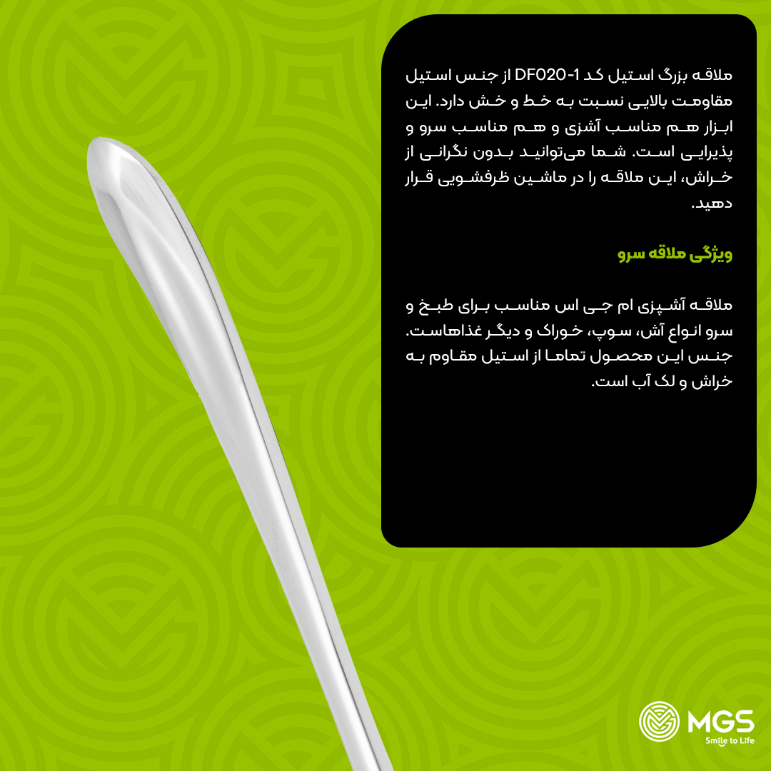 ملاقه آشپزی ام جی اس مناسب برای طبخ و سرو انواع آش، سوپ، خوراک و دیگر غذاهاست. جنس این محصول تماما از استیل مقاوم به خراش و لک آب است.