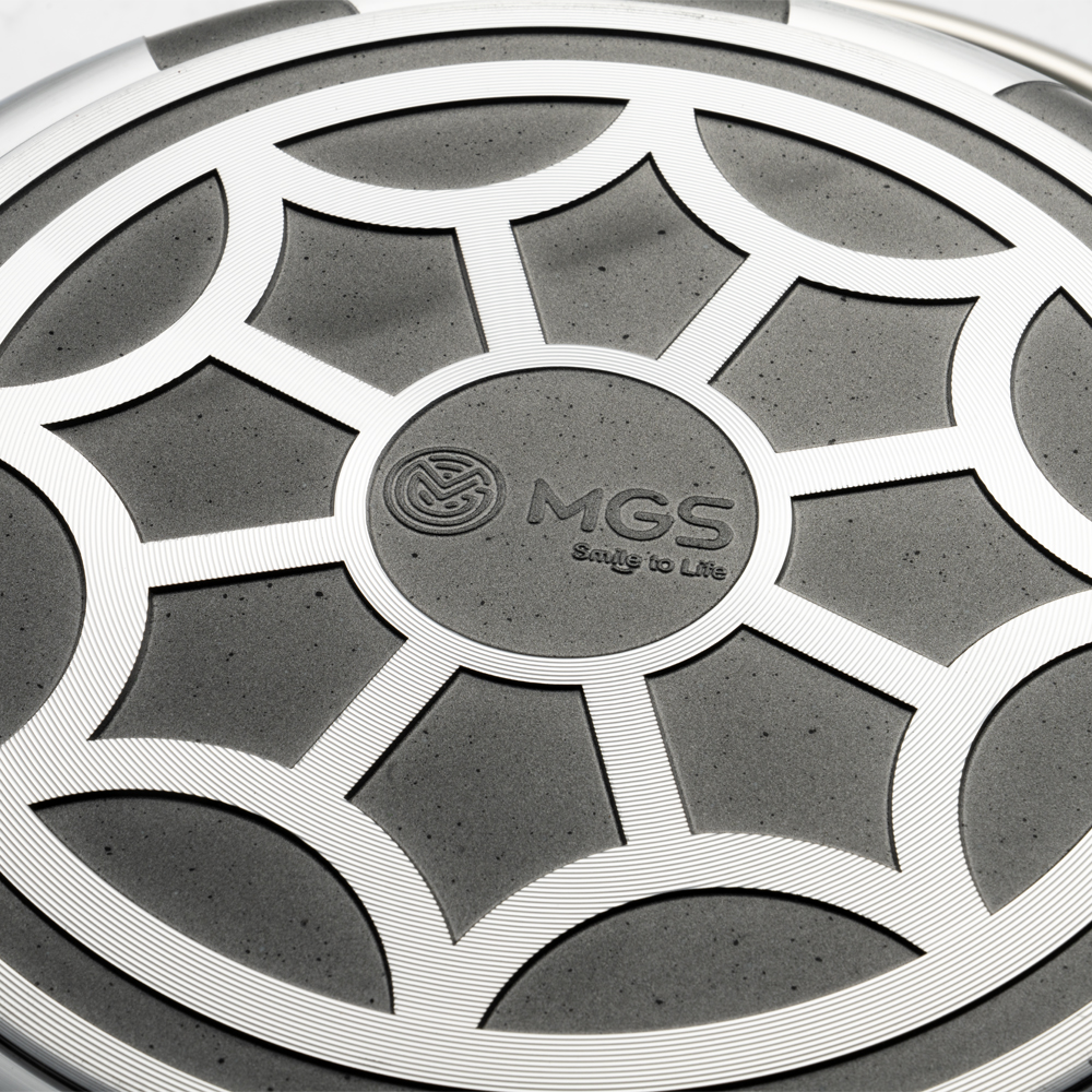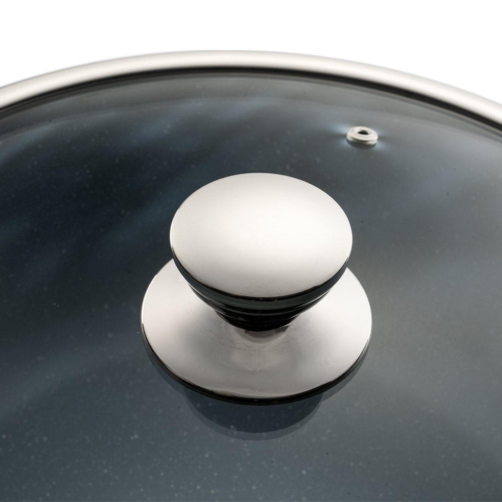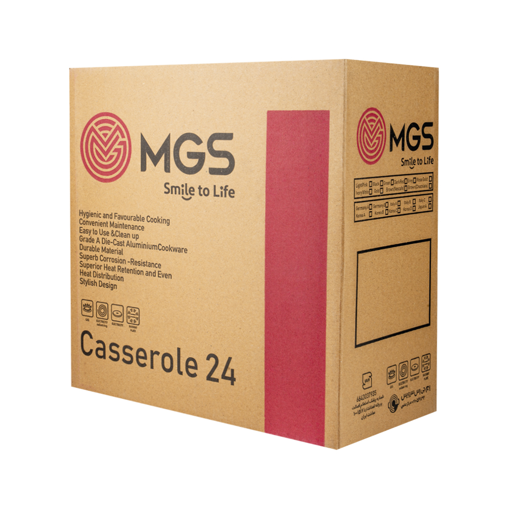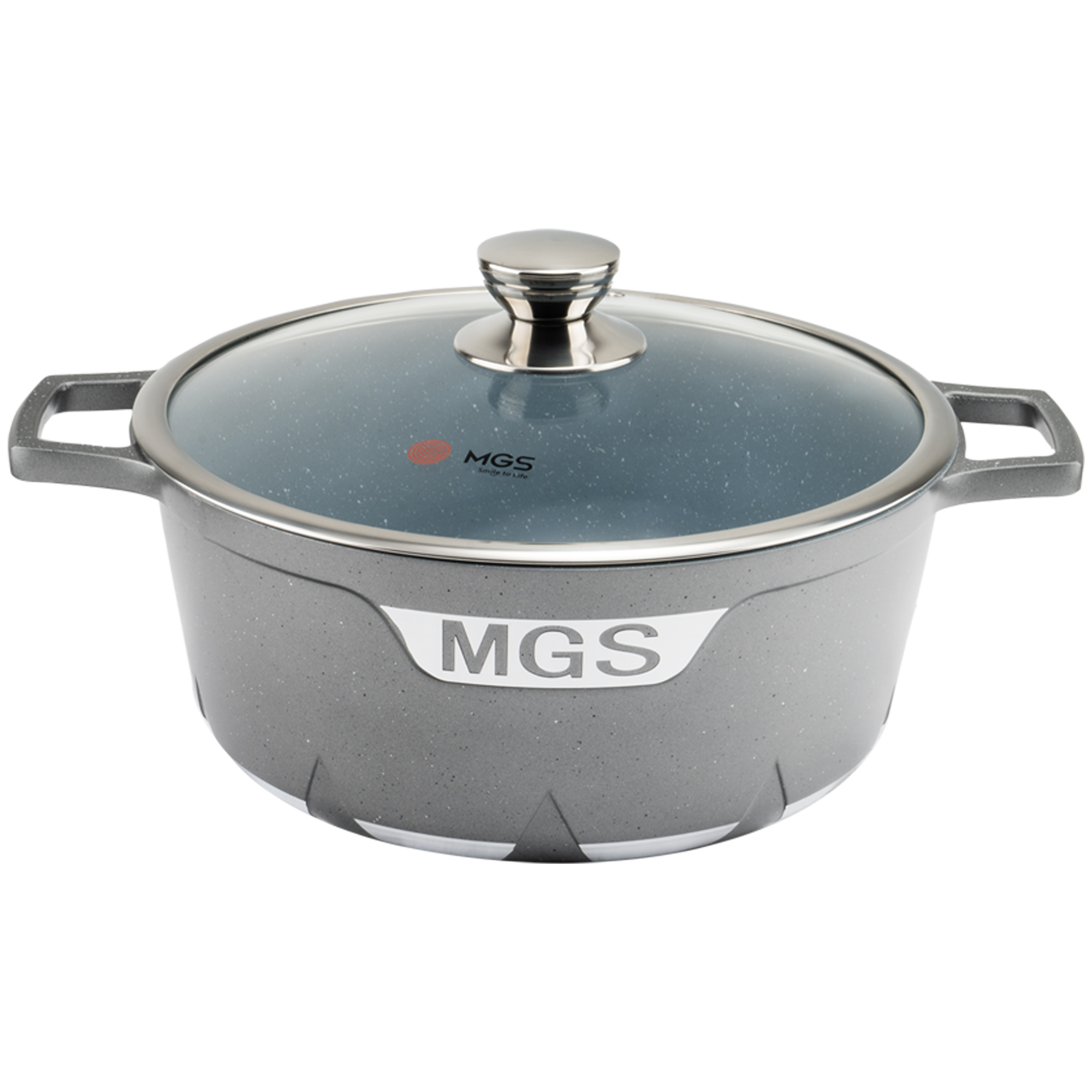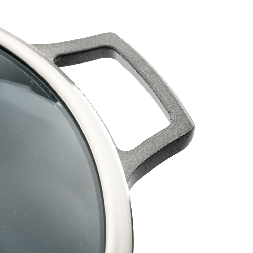 قابلمه تک طرح جرمنی سایز 24 روکشی از جنس گرانیت نچسب دارد که به آشپزی آسان و بیدردسر کمک میکند. درب این محصول از جنس پیرکس است.