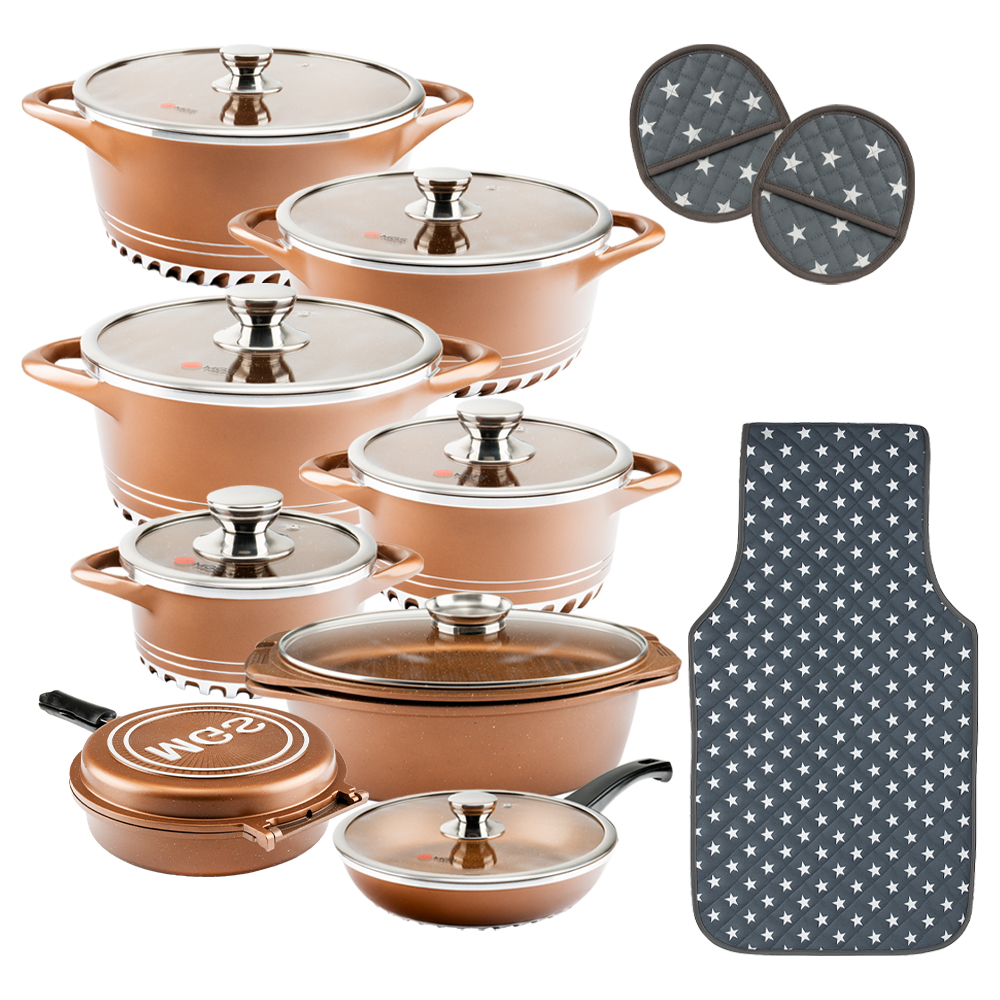 سرویس قابلمه 22 پارچه گرانیت طرح ایتالیا C یک سرویس ظروف پخت و پز عالی برای هر سلیقهای است. این ست شامل 5 قابلمه در سایزهای 16/20/24/28/32 و تابه تک دسته سایز 24 بعلاوه یک تابه دوطرفه، مرغ پز 3تکه، چهار عدد دستگیره و یک عدد پیشبند میباشد.