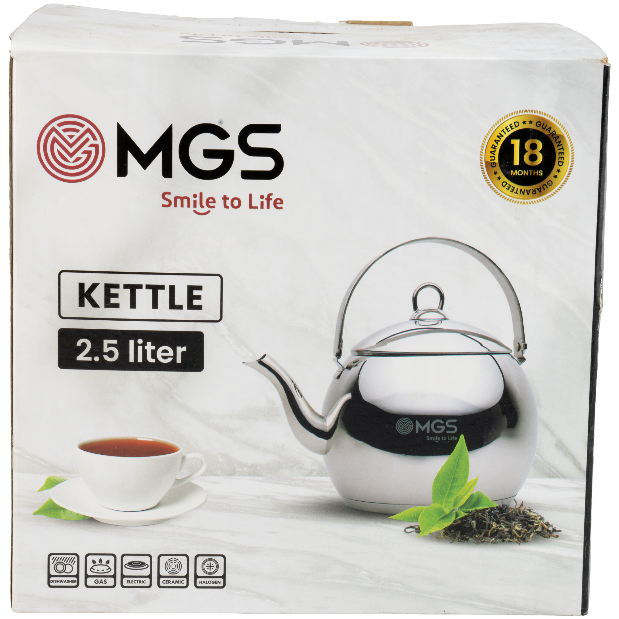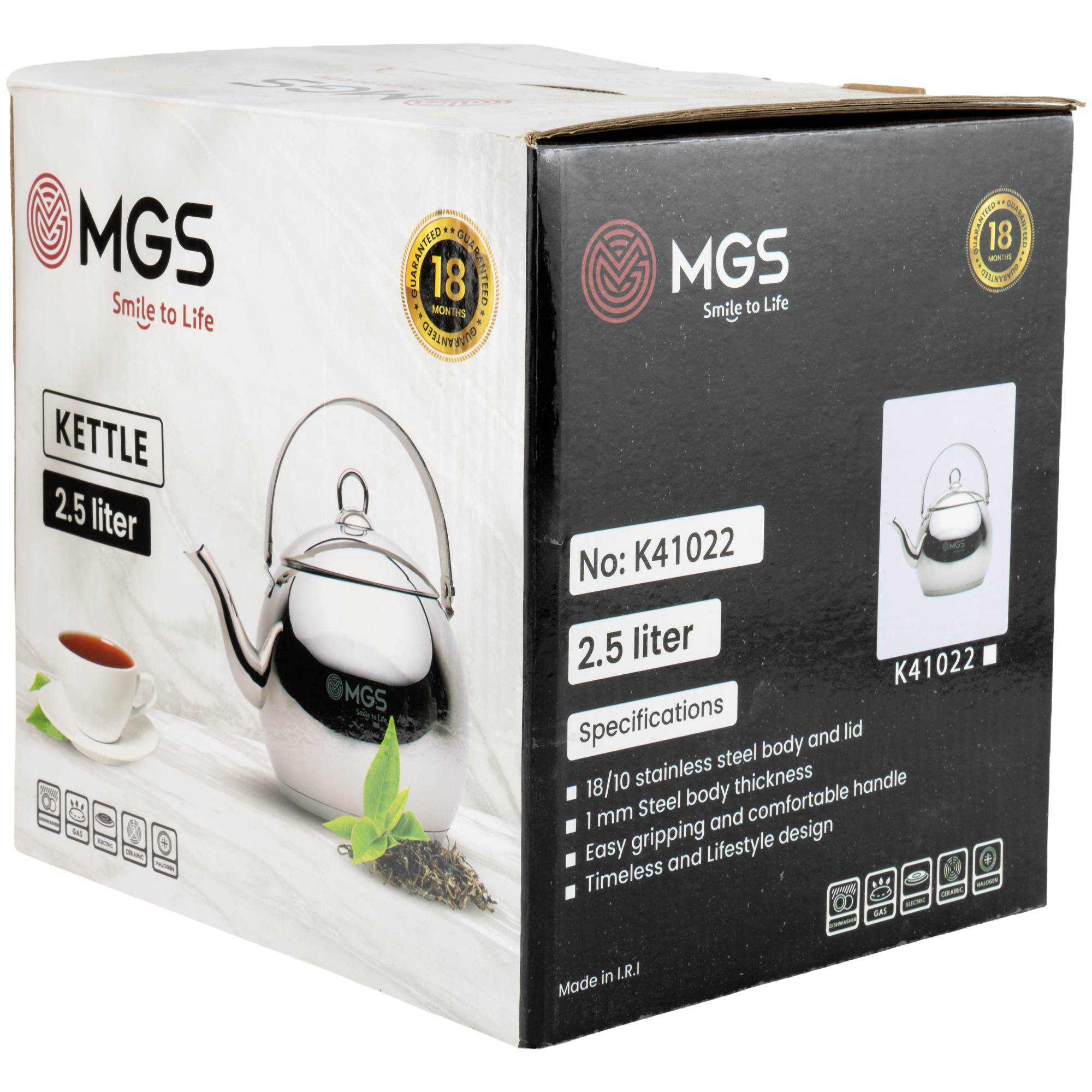 کتری استیل 2.5 لیتری MGS کد K41022 یکی از کاربردیترین لوازم خانه و آشپزخانه است. این کتری بدنهای از جنس استیل ضد زنگ دارد. این کتری با بدنه نیمه براق، قابل استفاده روی انواع اجاق گاز و قابل شستشو با دست و ماشین ظرفشویی است.