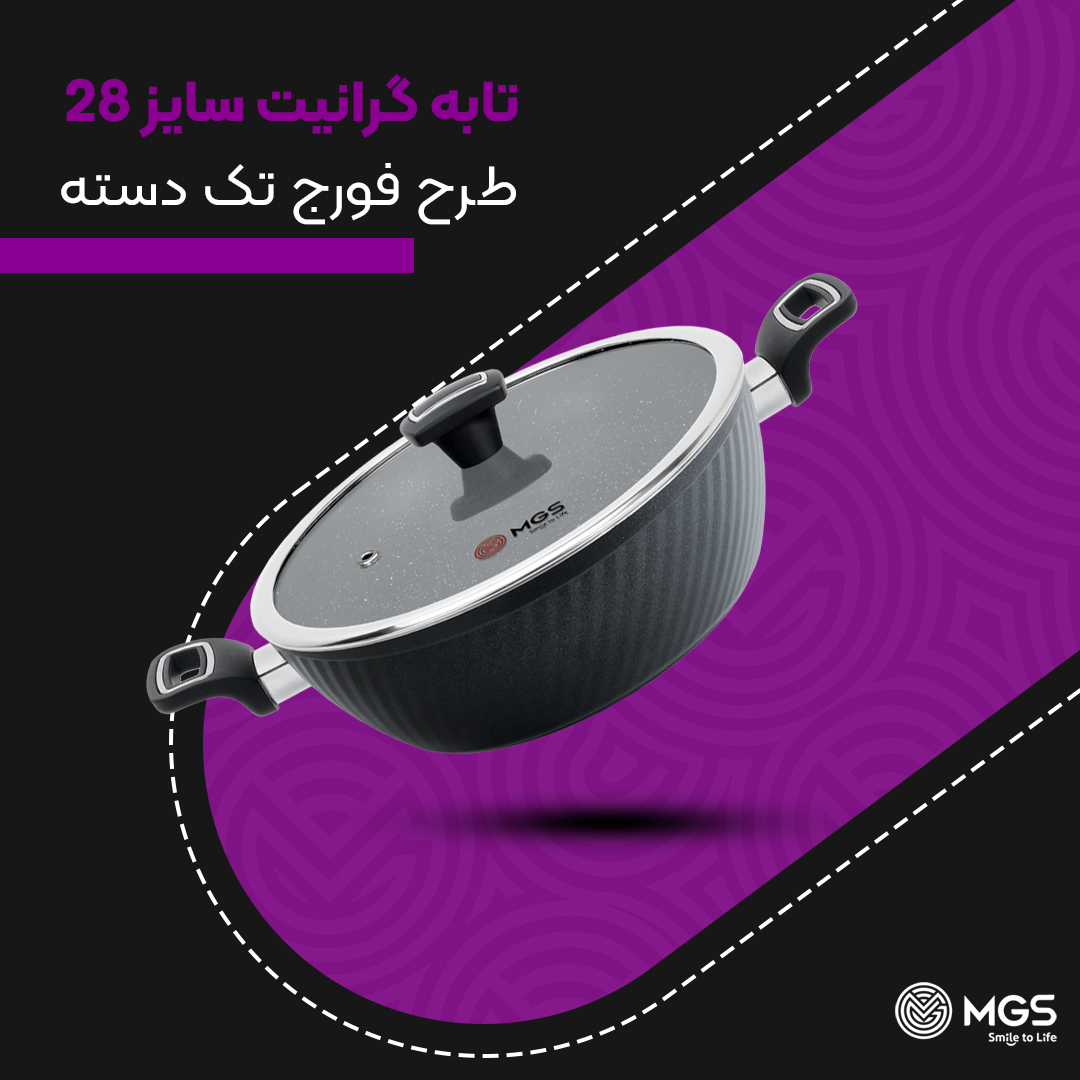تابه سایز 28 دو دسته طرح فورج سری پنج از جنس گرانیت و مدل فورج است، دستههای این تابه از جنس پلاستیک و متصل به بدنه میباشد. این تابه گرانیتی بزرگ با قطر 28 سانتیمتر مناسب طبخ انواع غذاست.