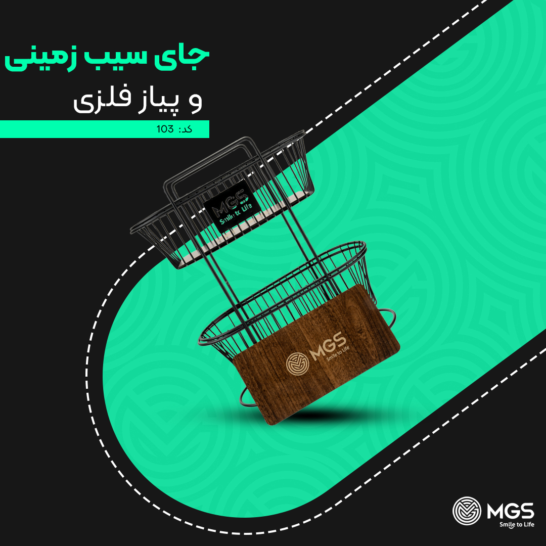 سبد سیب زمینی پیاز دو طبقه فلزی MGS با بدنه‌ای از جنس فلز مقاوم به رطوبت و کف چوبی برای جلوگیری از پخش شدن پوست و خاک در فضای آشپزخانه. سبد سیب زمینی و پیاز ام جی اس دو سبد بر روی یک پایه قرار دارد که می‌توان آن را در آشپزخانه یا بالکن گذاشت.