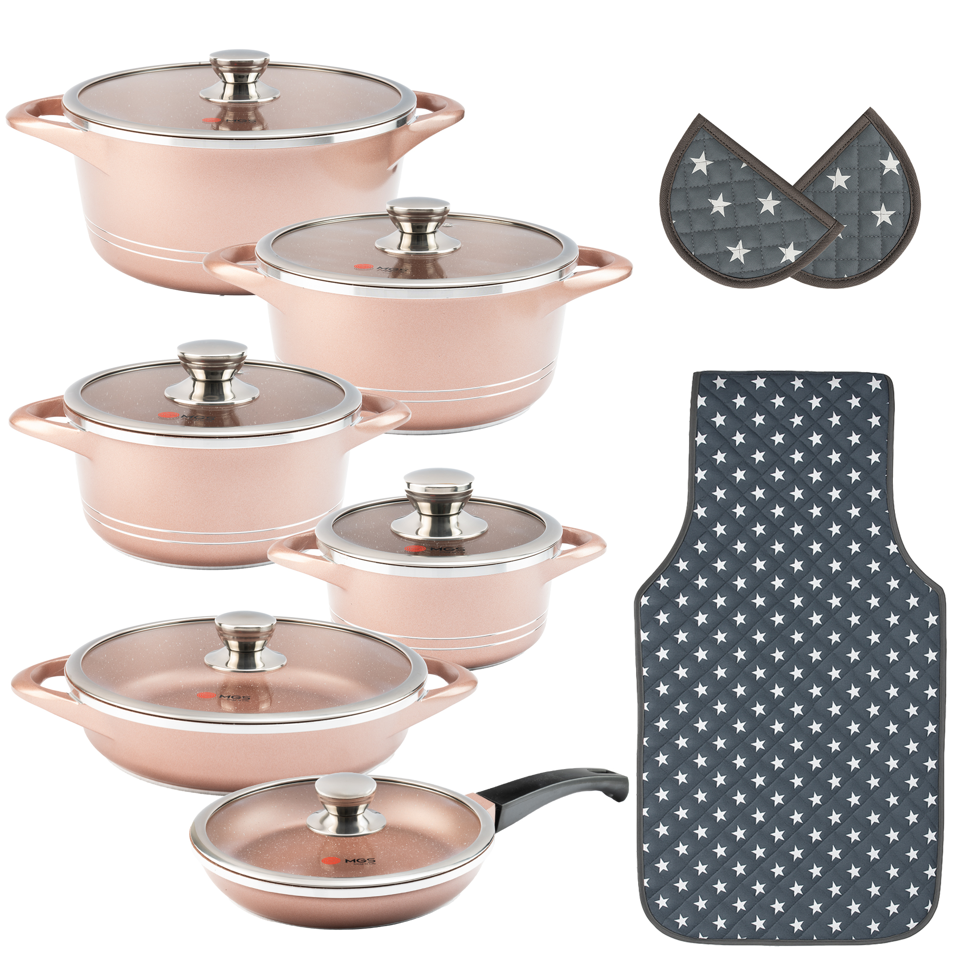 سرویس قابلمه 15 پارچه گرانیتی MGS طرح ایتالیا B یک سرویس ظروف پخت و پز عالی برای هر سلیقهای است. این ست شامل چهار قابلمه در سایزهای 16/20/24/28 و تابه دو دسته سایز 28 بعلاوه یک تابه تکدسته، دو عدد دستگیره و یک عدد پیشبند میباشد.