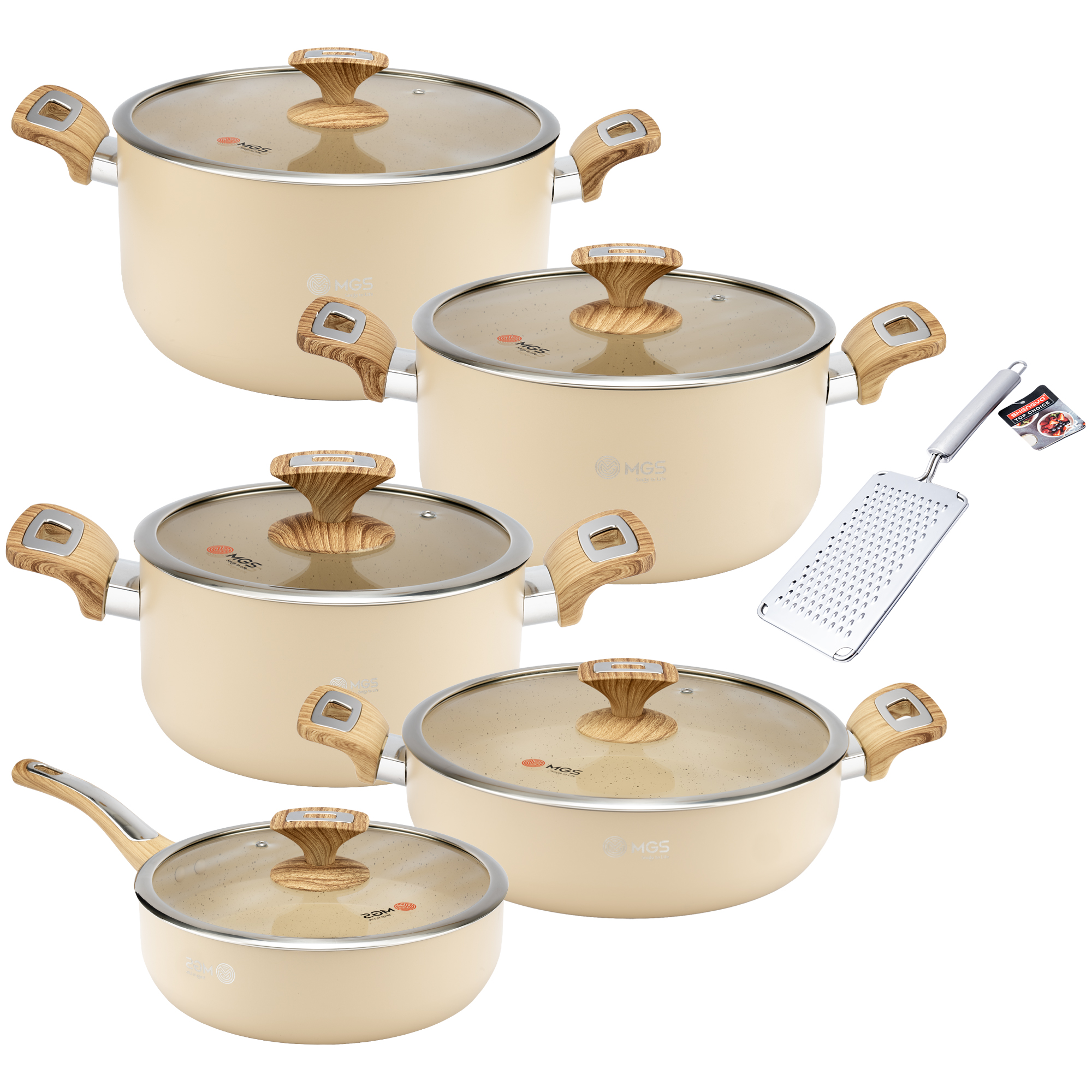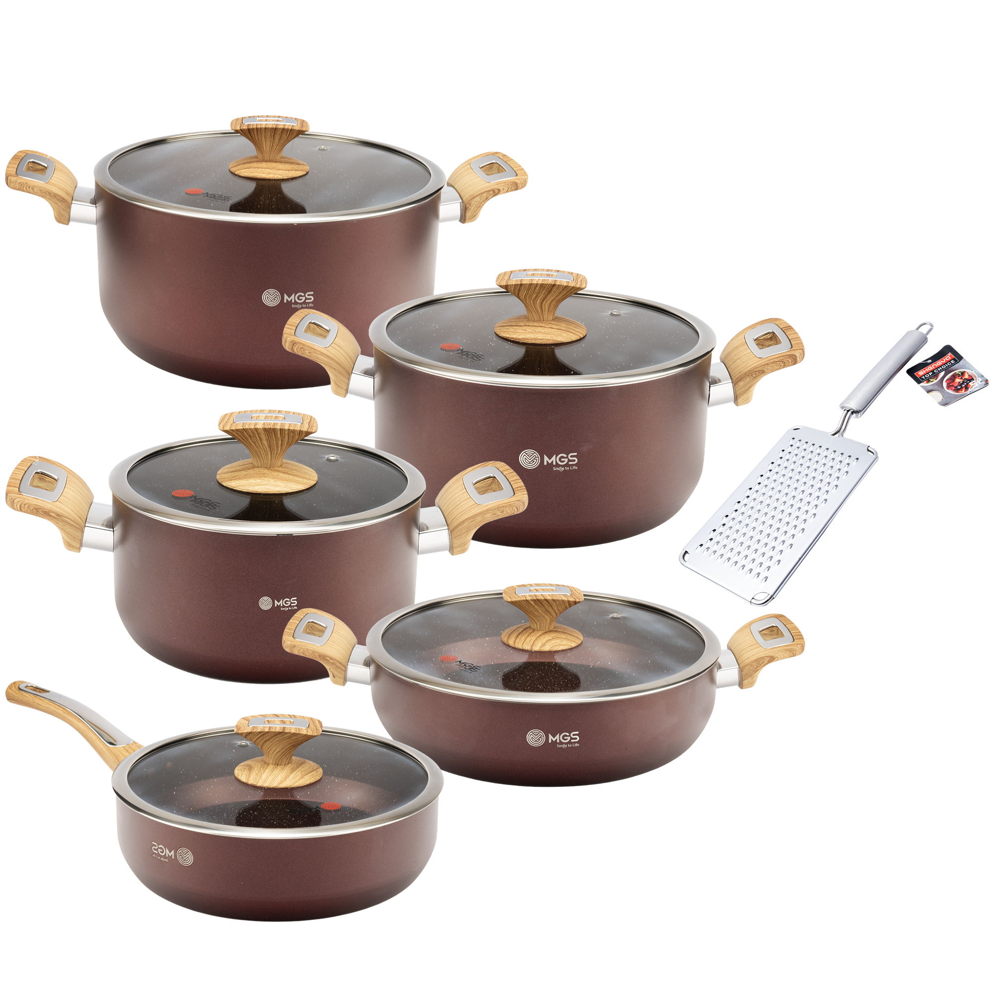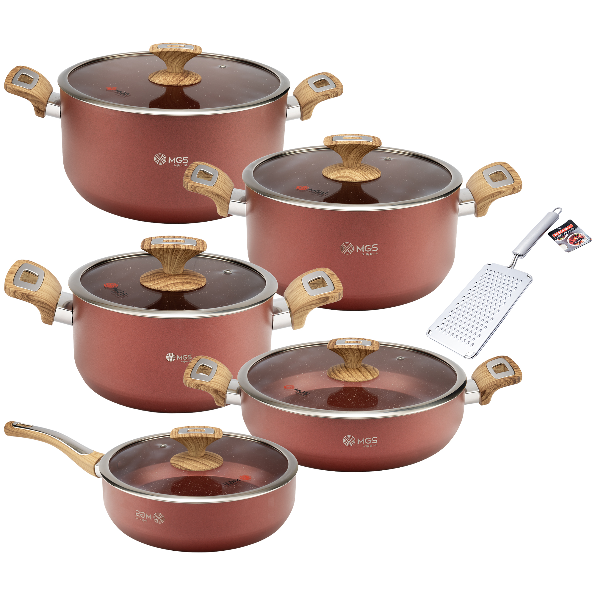 سرویس قابلمه 11 پارچه MGS مدل گارنت یک سرویس ظروف پخت و پز عالی برای هر سلیقه‌ای، از جنس گرانیت و مدل کششی است است. این ست شامل سه قابلمه در سایزهای 20/24/28 و یک تابه دو دسته سایز 28 بعلاوه یک تابه تک دسته 24 و رنده می‌باشد.