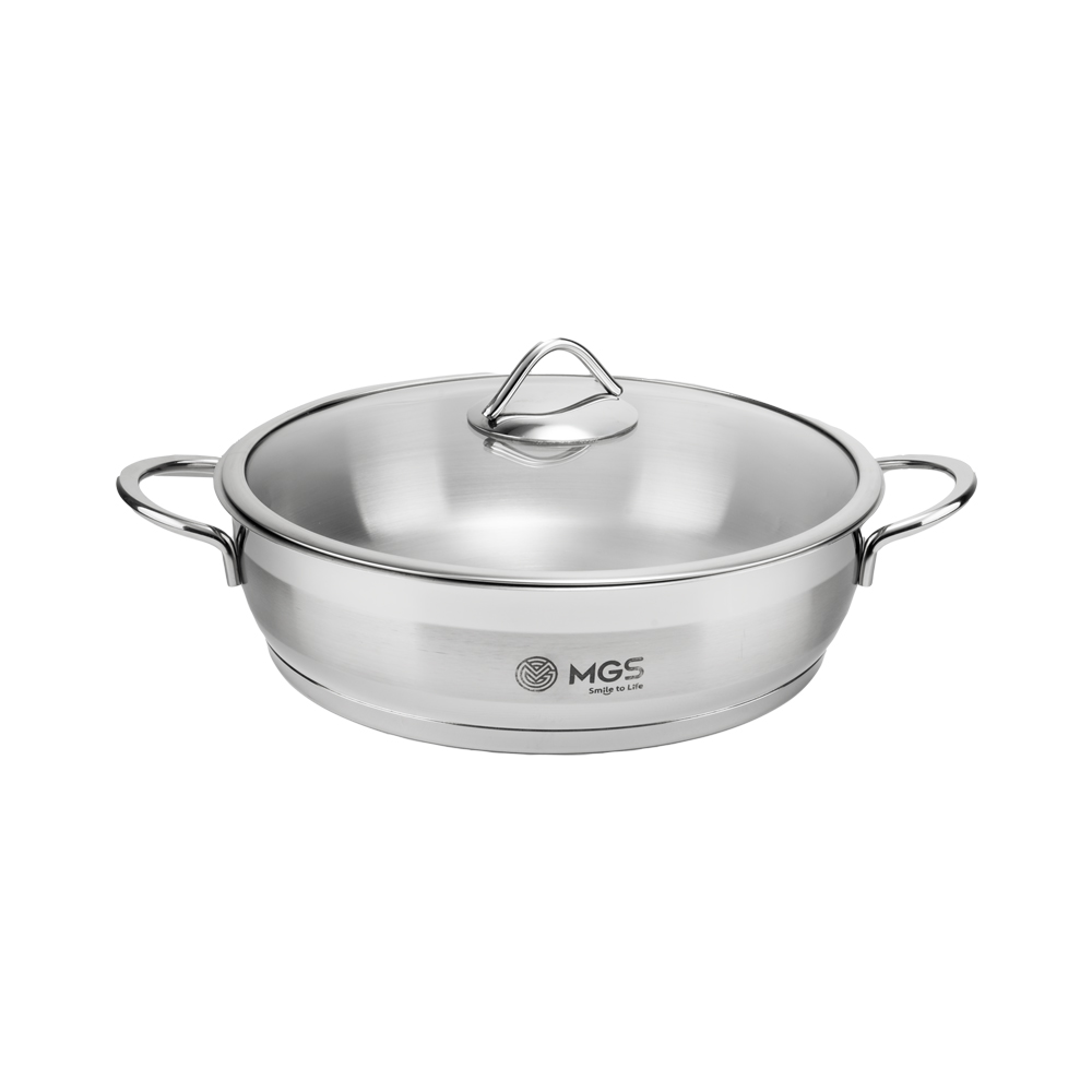 تابه تک سایز 28 بدنهای از جنس استیل نچسب دارد که به آشپزی آسان و بیدردسر کمک میکند. درب این محصول از جنس پیرکس است.