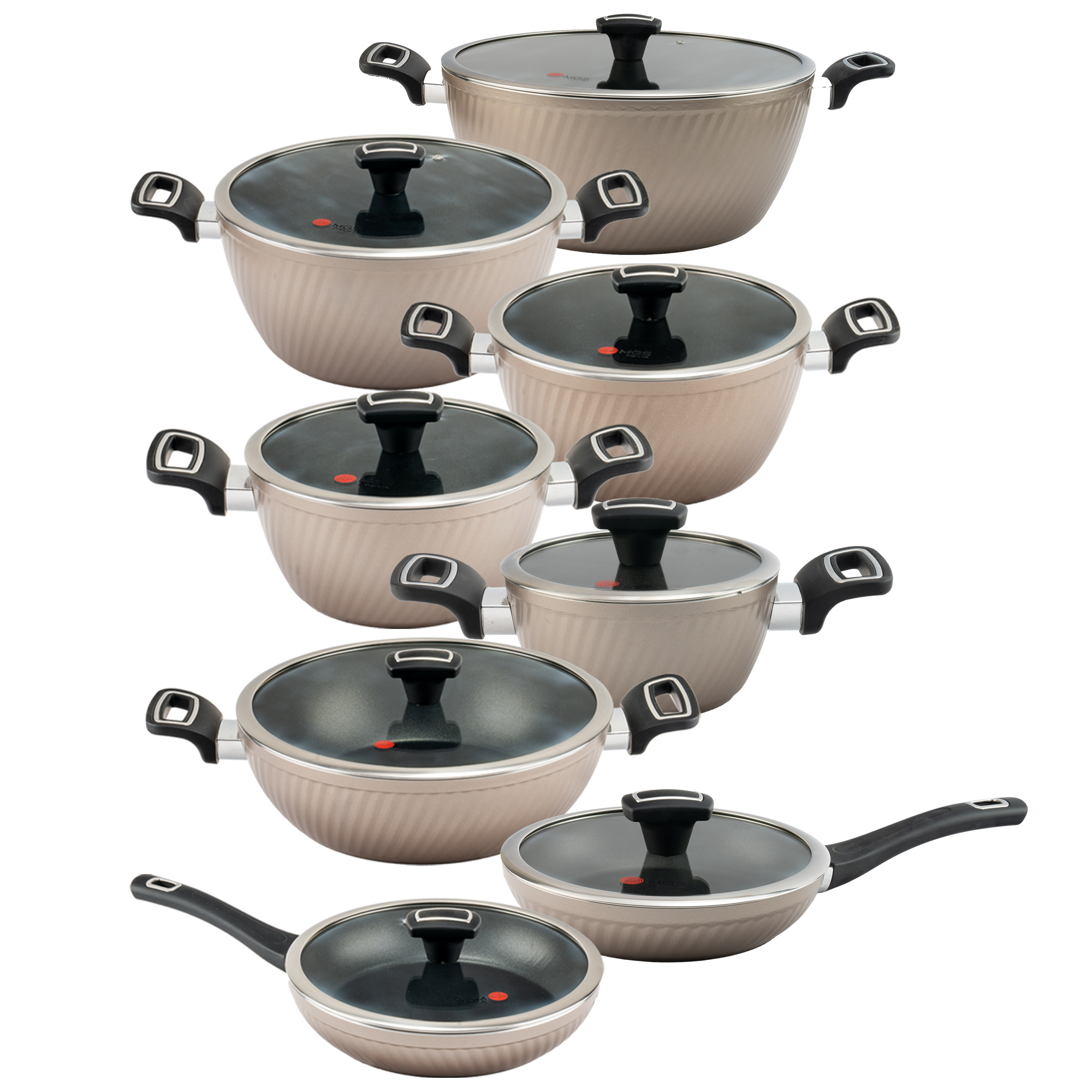 این سرویس قابلمه 16 پارچه طرح ماینز شامل پنج قابلمه و پنج درب پیرکس بعلاوه دو تابه تک دسته همراه درب و یک تابه دو دسته است. جنس روکش این ست، گرانیت نچسب است. نحوه ساخت این سرویس قابلمه 16 پارچه فورج و دستههای آن به بدنه متصل شده است.
