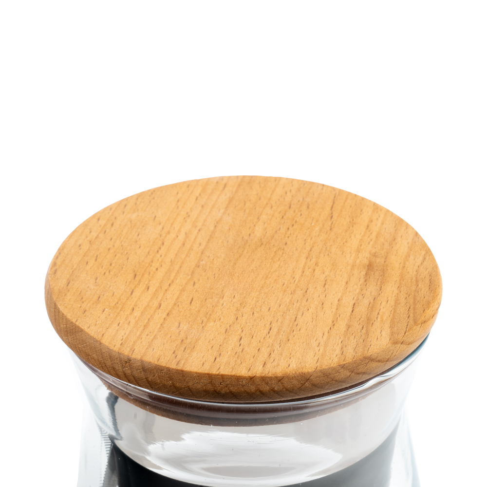 بانکه شیشه‌ای ام جی اس با درب چوبی محکم، قابل استفاده برای حبوبات، ادویه و مواد غذایی است.