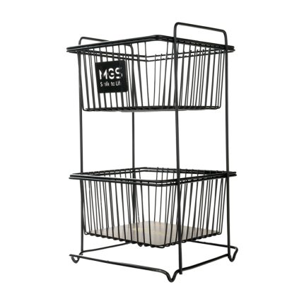 سبد سیب زمینی پیاز دو طبقه فلزی MGS با بدنه‌ای از جنس فلز مقاوم به رطوبت و کف چوبی برای جلوگیری از پخش شدن پوست و خاک در فضای آشپزخانه. سبد سیب زمینی و پیاز ام جی اس دو سبد بر روی یک پایه قرار دارد که می‌توان آن را در آشپزخانه یا بالکن گذاشت.