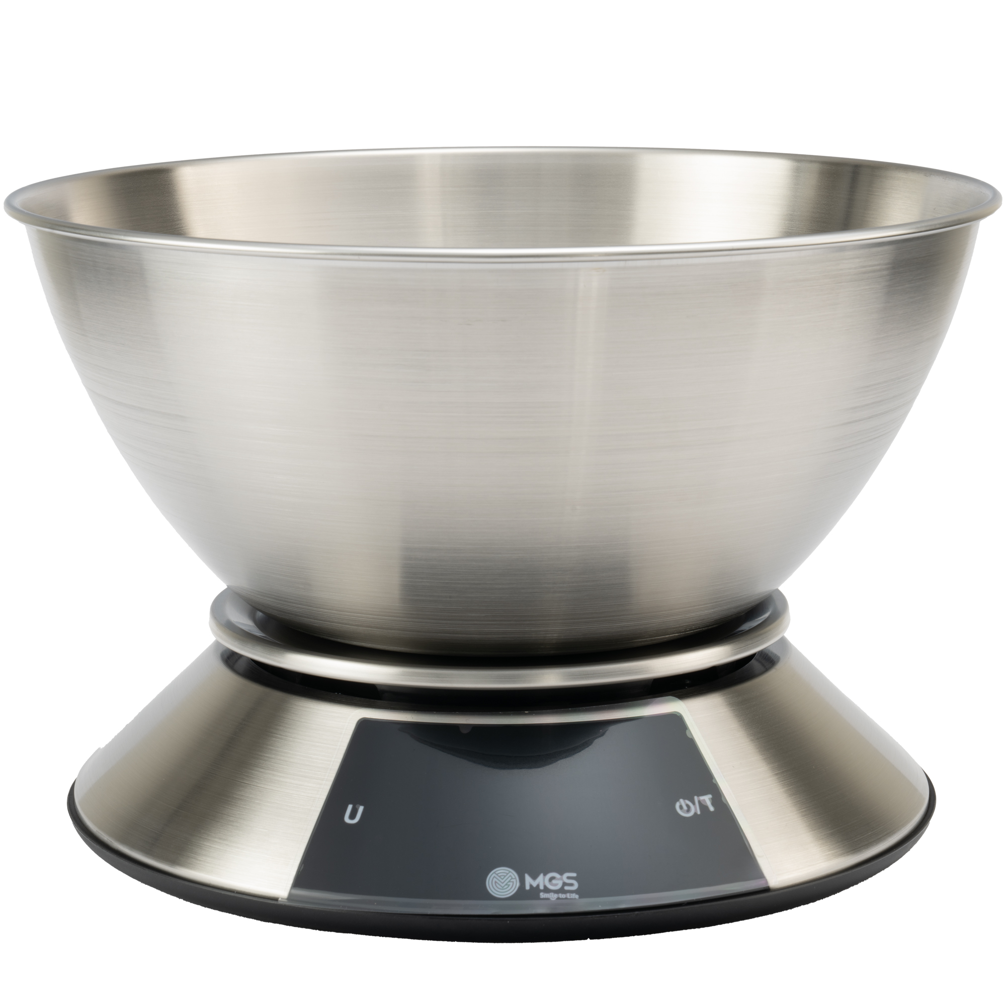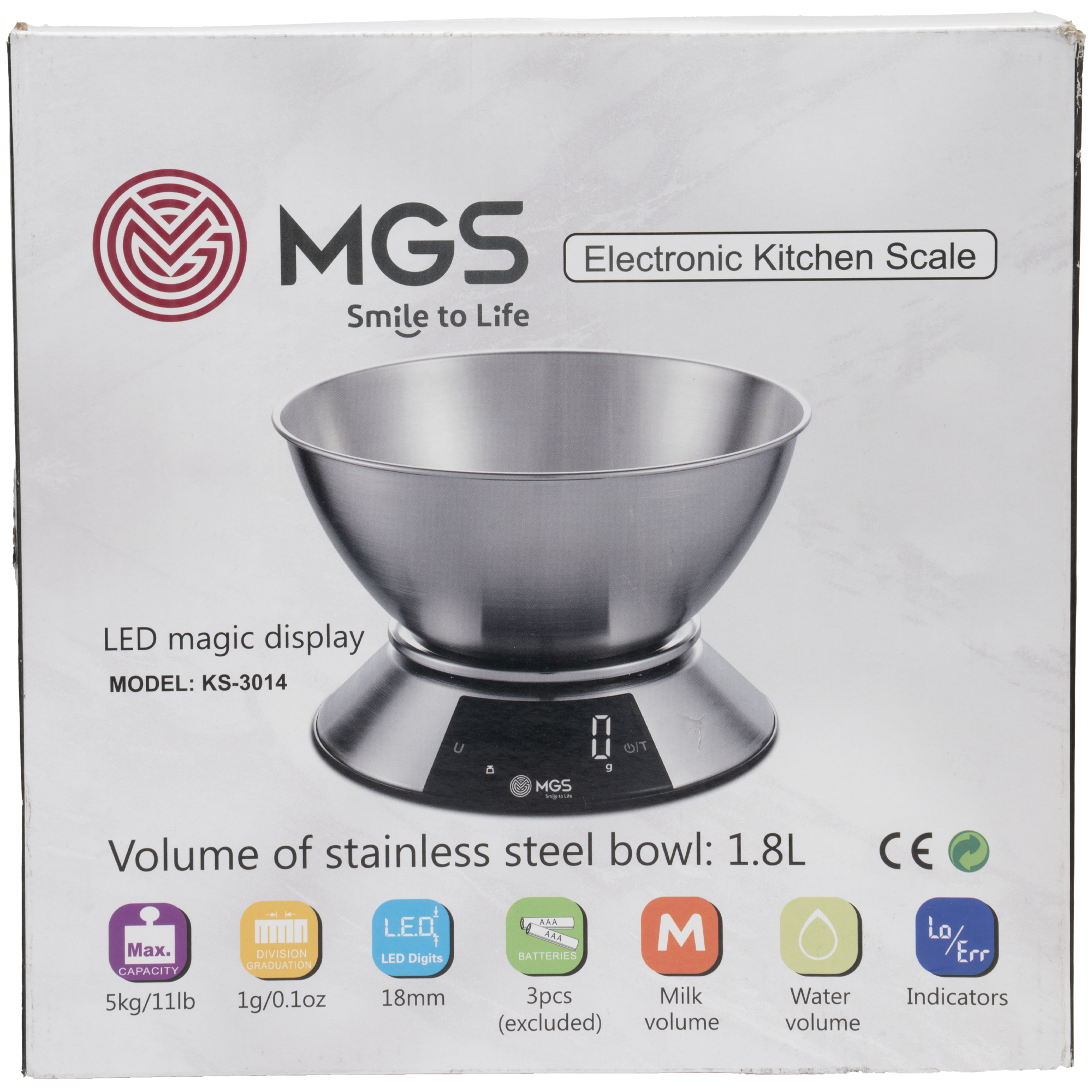 ترازو ام جی اس با کاسه و بدنه‌ای از جنس استیل قابل استفاده برای اندازه گیری تمامی مواد غذایی خشک یا تر در آشپزخانه است.