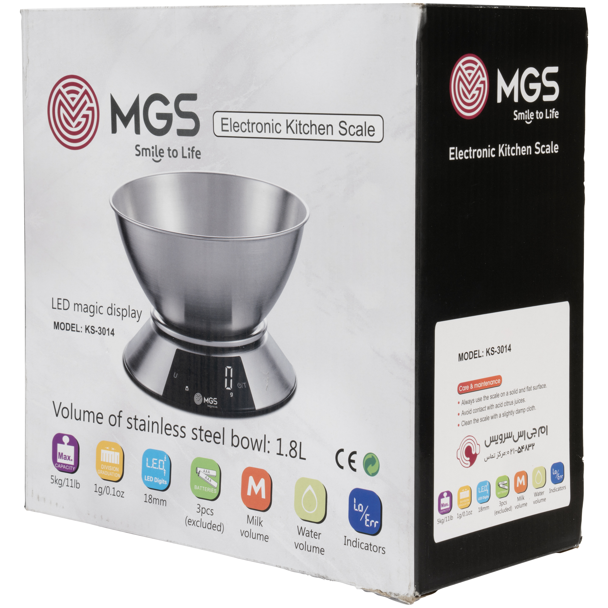 ترازو کاسه دار MGS کد KS3014 مناسب برای استفاده در آشپزخانه است. شما می‌توانید از این ترازو برای اندازه گیری مقدار مواد غذایی استفاده کنید. این ترازو به خاطر شکل ظاهری خود به نام ترازو کاسه دار شناخته می‌شود.