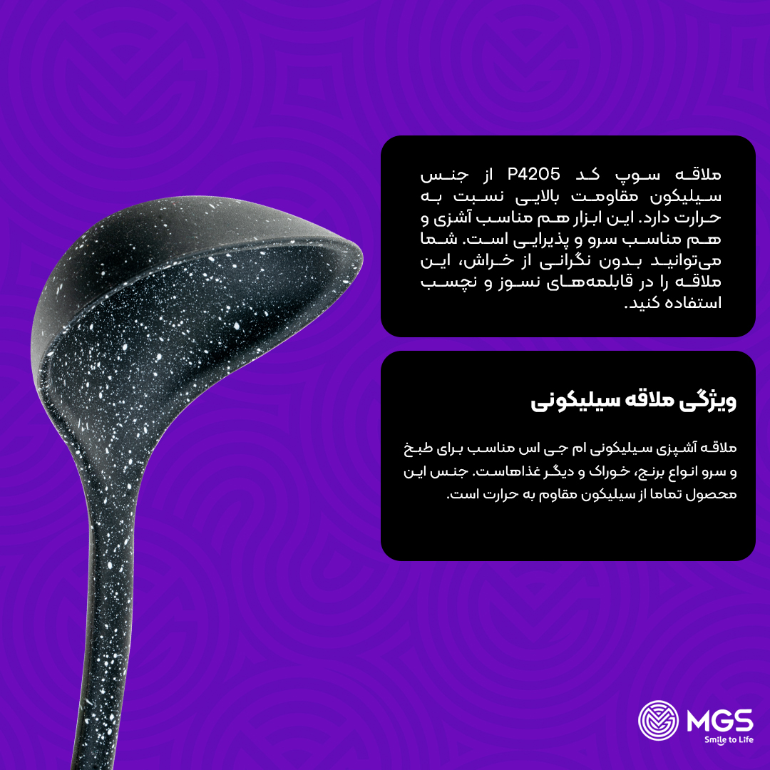 ملاقه سیلیکونی ام جی اس مناسب آشپزی و سرو غذا است. این ملاقه آشپزی تماما از سیلیکون مقاوم به حرارت ساخته شده‌است.