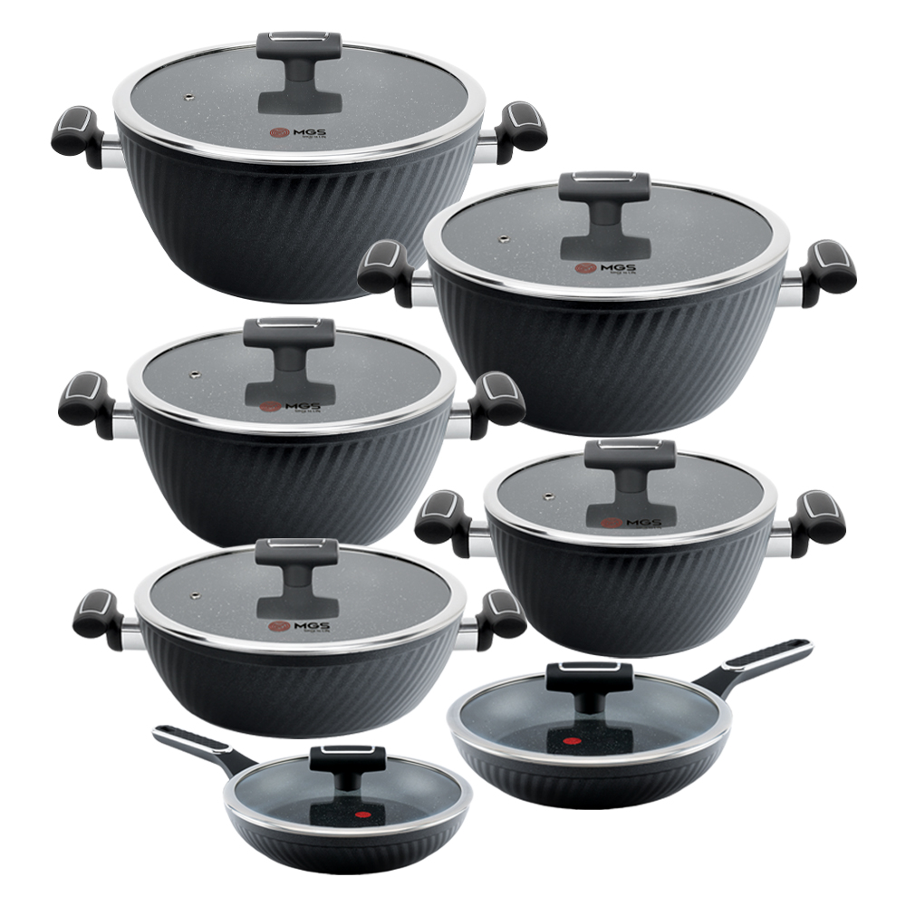 این سرویس قابلمه 14 پارچه شامل چهار قابلمه و چهار درب پیرکس بعلاوه دو تابه تک دسته همراه درب است. جنس روکش این ست، گرانیت نچسب است. نحوه ساخت این سرویس قابلمه 14 پارچه فورج و دستههای آن به بدنه متصل شده است.